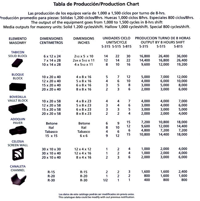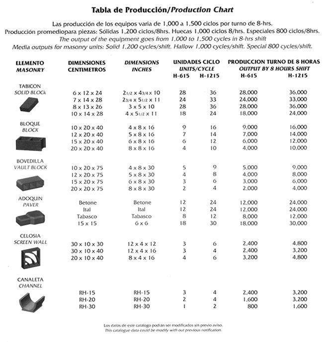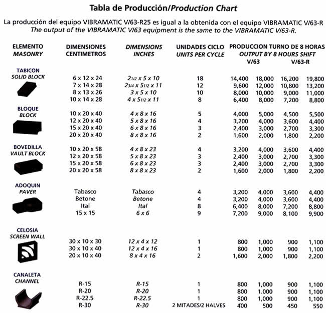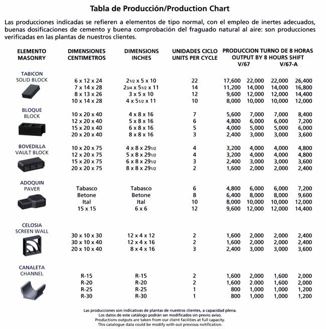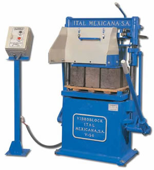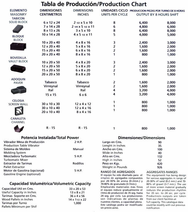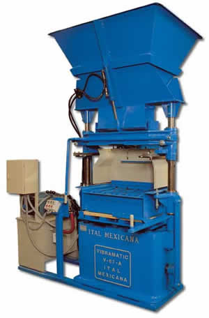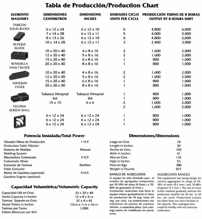 Equipos para la producción de elementos de concreto vibrocomprimidos, como tabicón, adoquín, bloque, celosía, bovedilla, canal de riego, machihembrado y piezas especiales. Únicos fabricados en fundición de hierro nodular garantizada y sistema de vibración uni-direccional para la elaboración de elementos de alta resistencia. Máquinas con capacidad de producción de 1,000 a 12,000 piezas (en bloque 15 x 20 x 40 cms.) por turno de 8 horas. Modelos manuales, semi-automáticos, automáticos y computarizados.