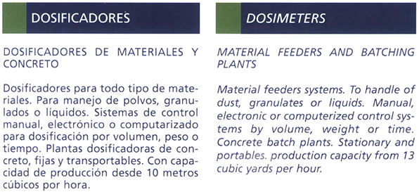 Dosificadores de materiales y concreto: Dosificadores para todo tipo de materiales. para manejo de polvos, granulados o líquidos. Sistemas de control manual, electrónico o computarizado para dosificación por volumen, peso o tiempo. Plantas dosificadoras de concreto, fijas y transportables. Con capacidad de producción desde 10 metros cúbicos por hora.