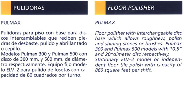 Pulidoras para piso con base para discos intercambiables que reciben piedras de desbaste, pilido y abrillantado o cepillo. Modelos Pulmax 300 y Pulmax 500 con discos de 300mm y 500mm de diámetro respectivamente. Equipo fijo modelo ELV-2 para pulidos de lozetas con capacidad de 80 metros cuadrados porturno.